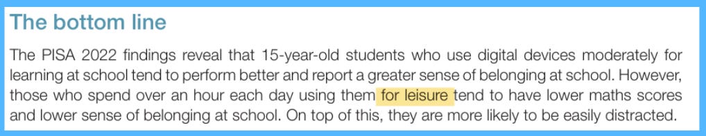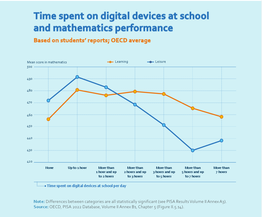 An important caveat: the PISA data showing negative correlations with screen time largely reflects leisure and recreational device use (social media, games, entertainment), not purposeful instructional technology integration for learning.